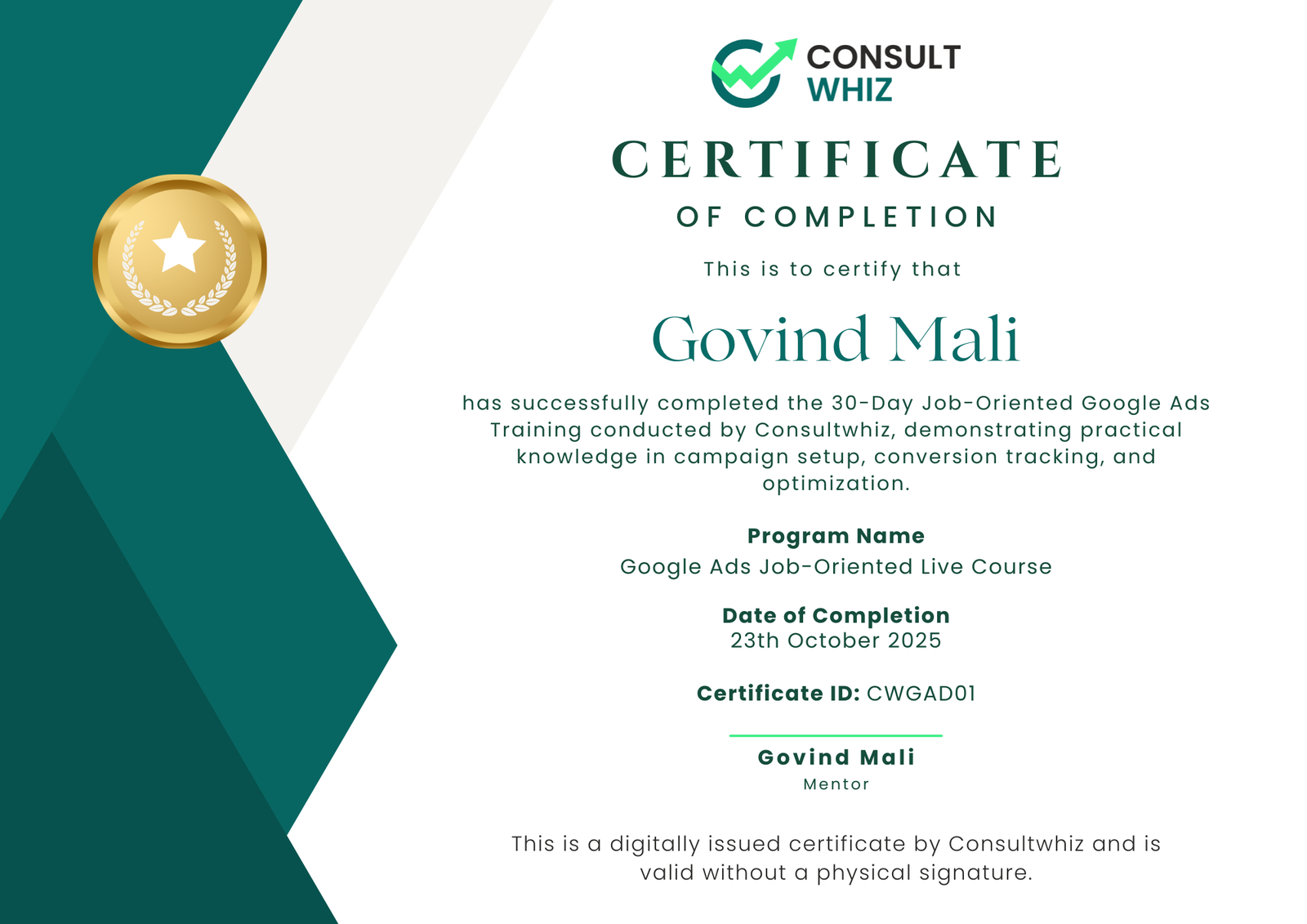 I recently completed the Google Ads course by Govind Mali (ConsultWhiz) and I’m extremely satisfied. The lessons were well-structured, practical, and easy to follow.What I appreciated most was that Govind Sir addressed all queries in live sessions, ensuring complete clarity throughout the course., which made the learning experience even more effective and personalized.